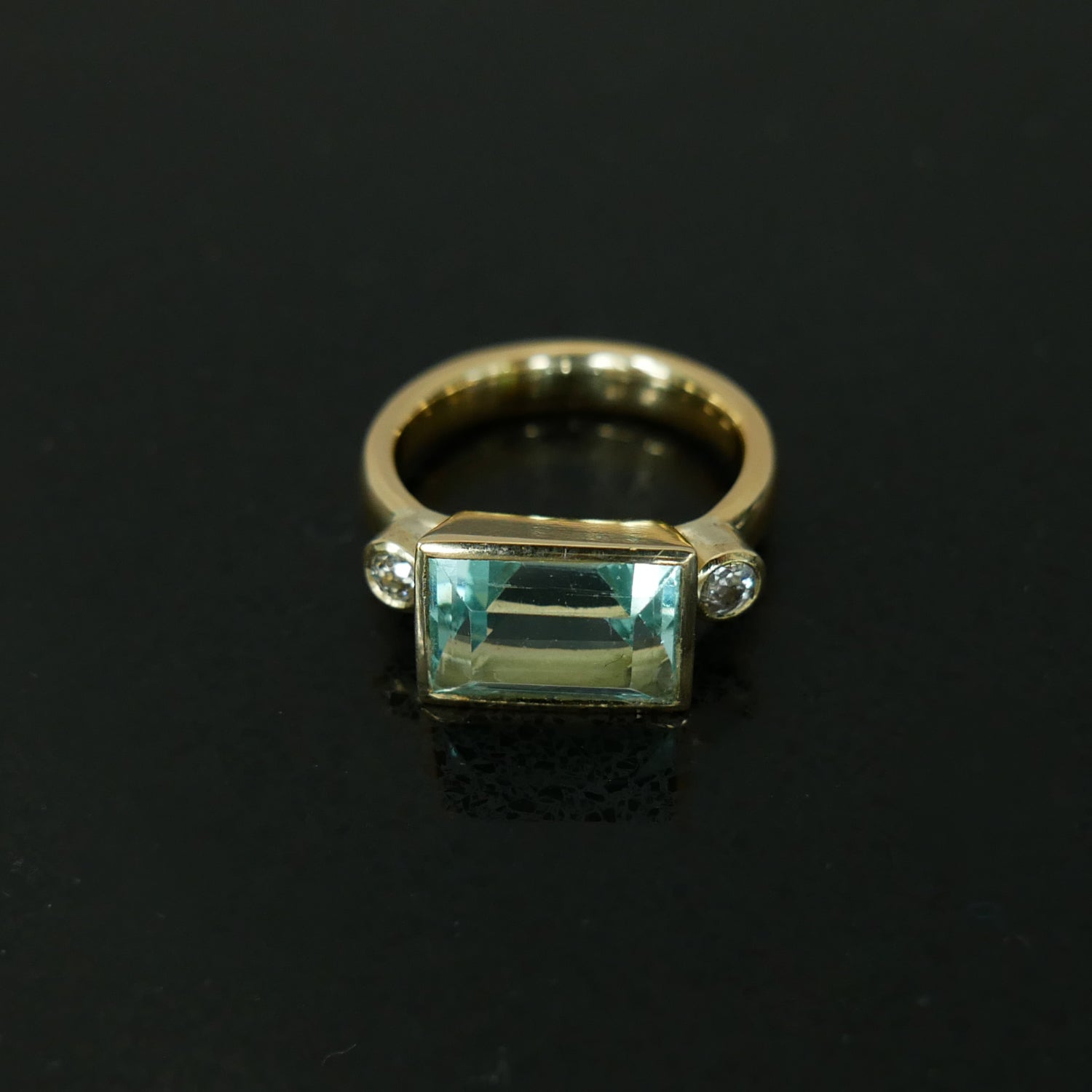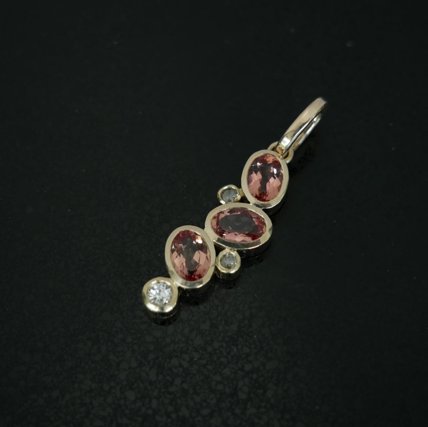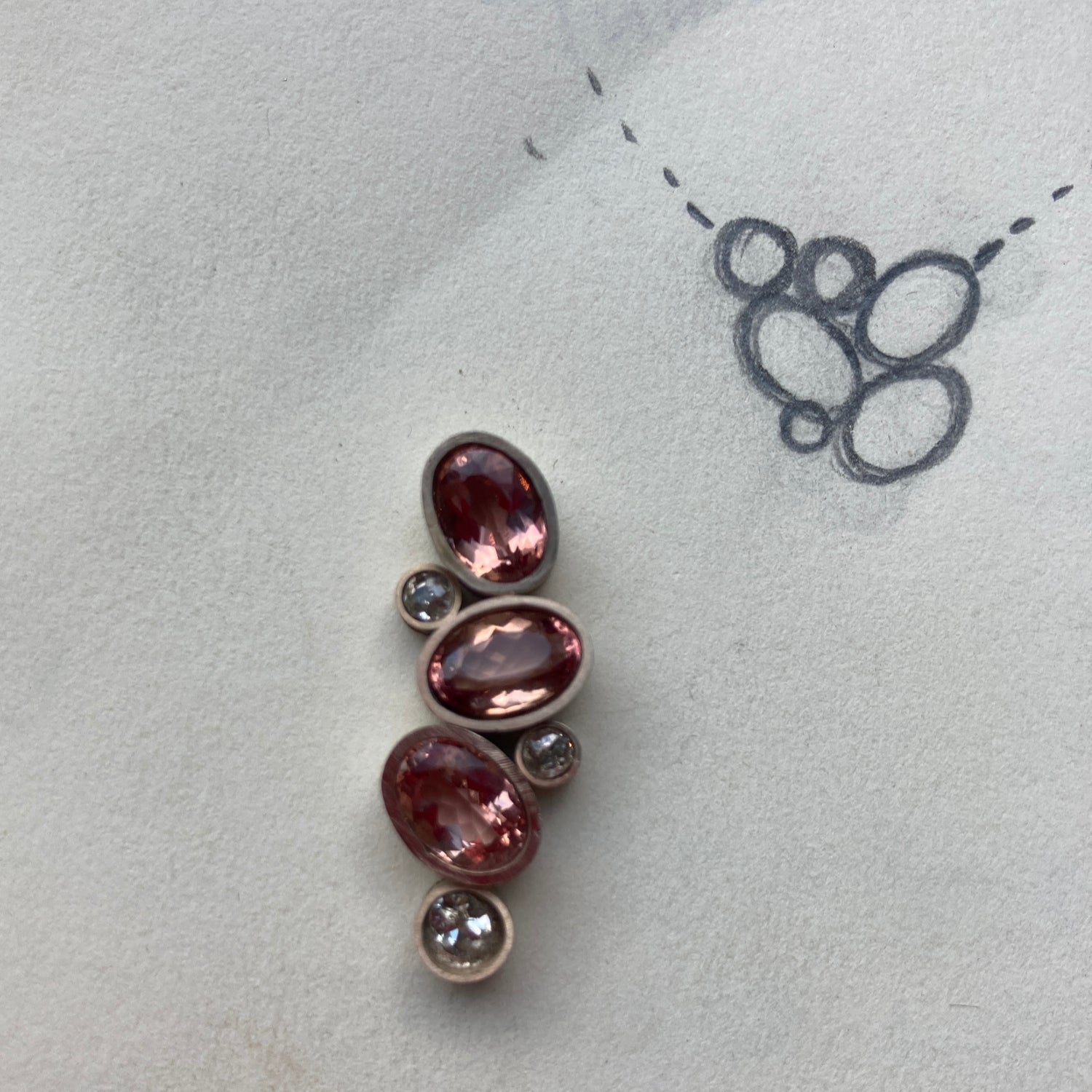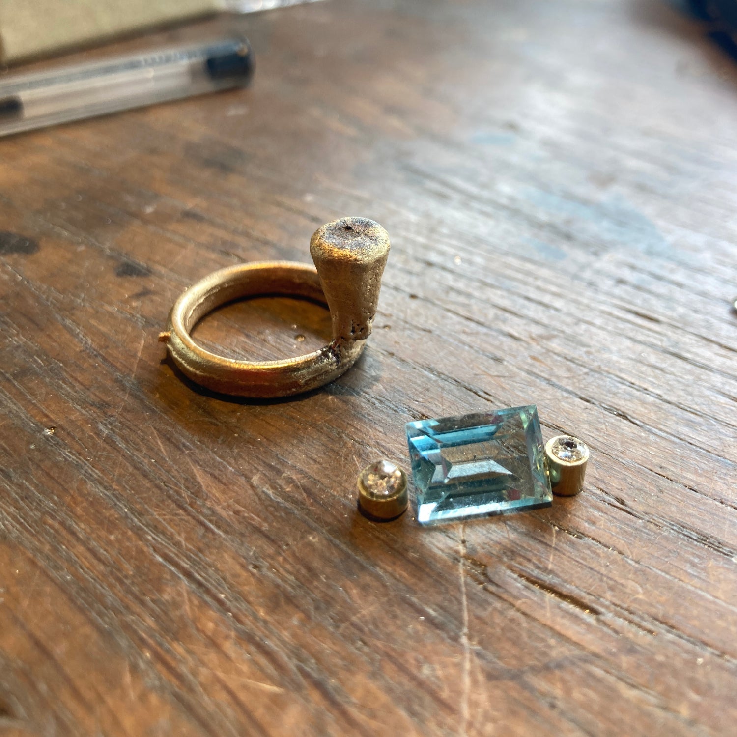 A beautiful baguette aquamarine and some unworn pieces of jewellery were the starting point for this gorgeous ring. At the same time, Alice made a pendant using three pink topaz the customer was keen to do something with. See bespoke piece No10.
