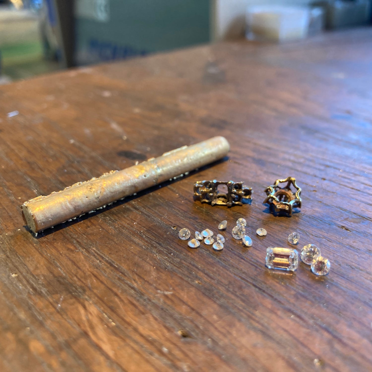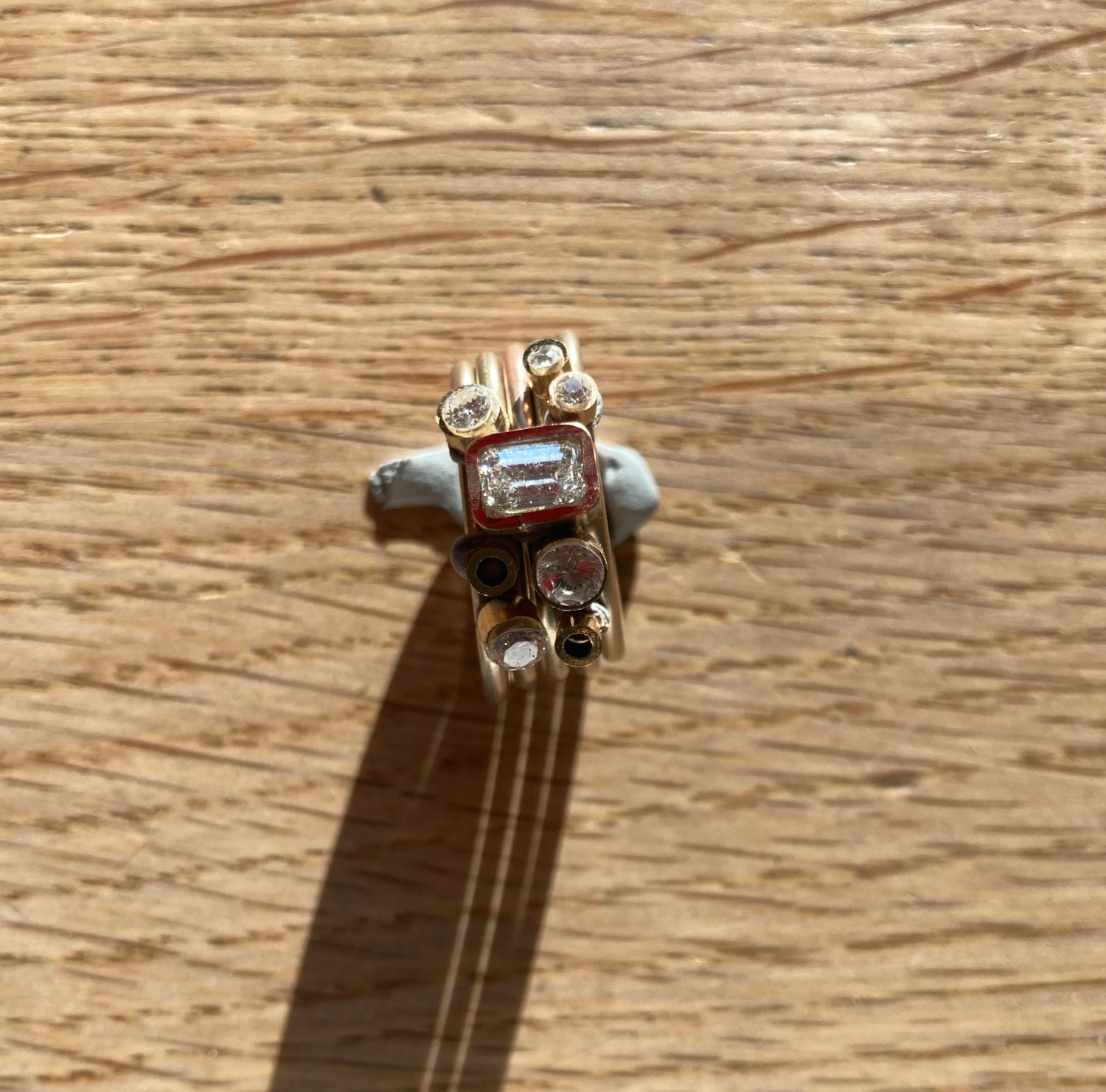 Alice has made many variations of this signature diamond ring. They are all unique, particularly when there has been an assortment of client stones to work with. She used the gold and diamonds from a number of rings belonging to her client to make this truly individual ring. There was also enough materials left to make her daughters an extra, surprise Christmas gift of a tiny diamond ring each.