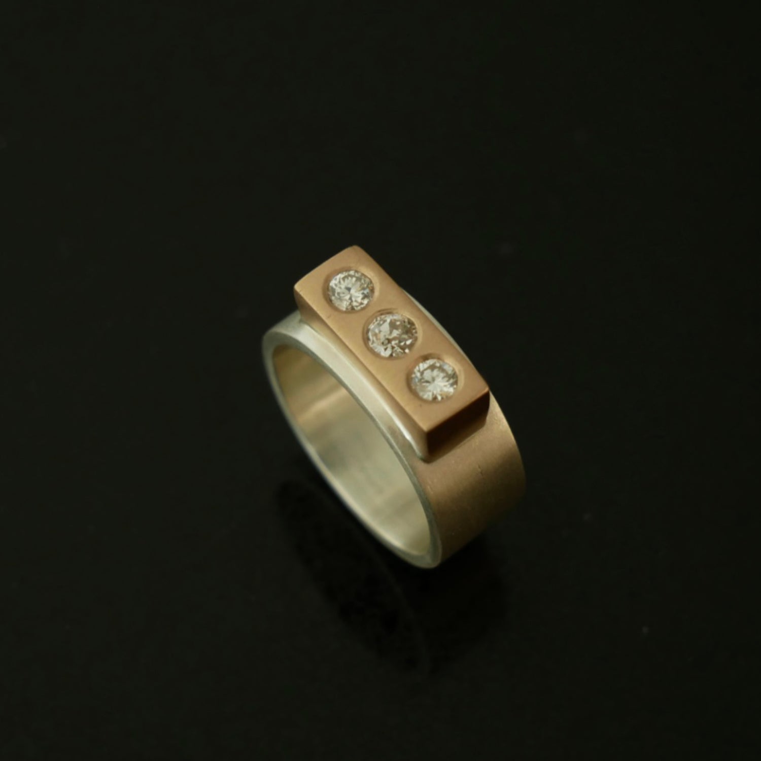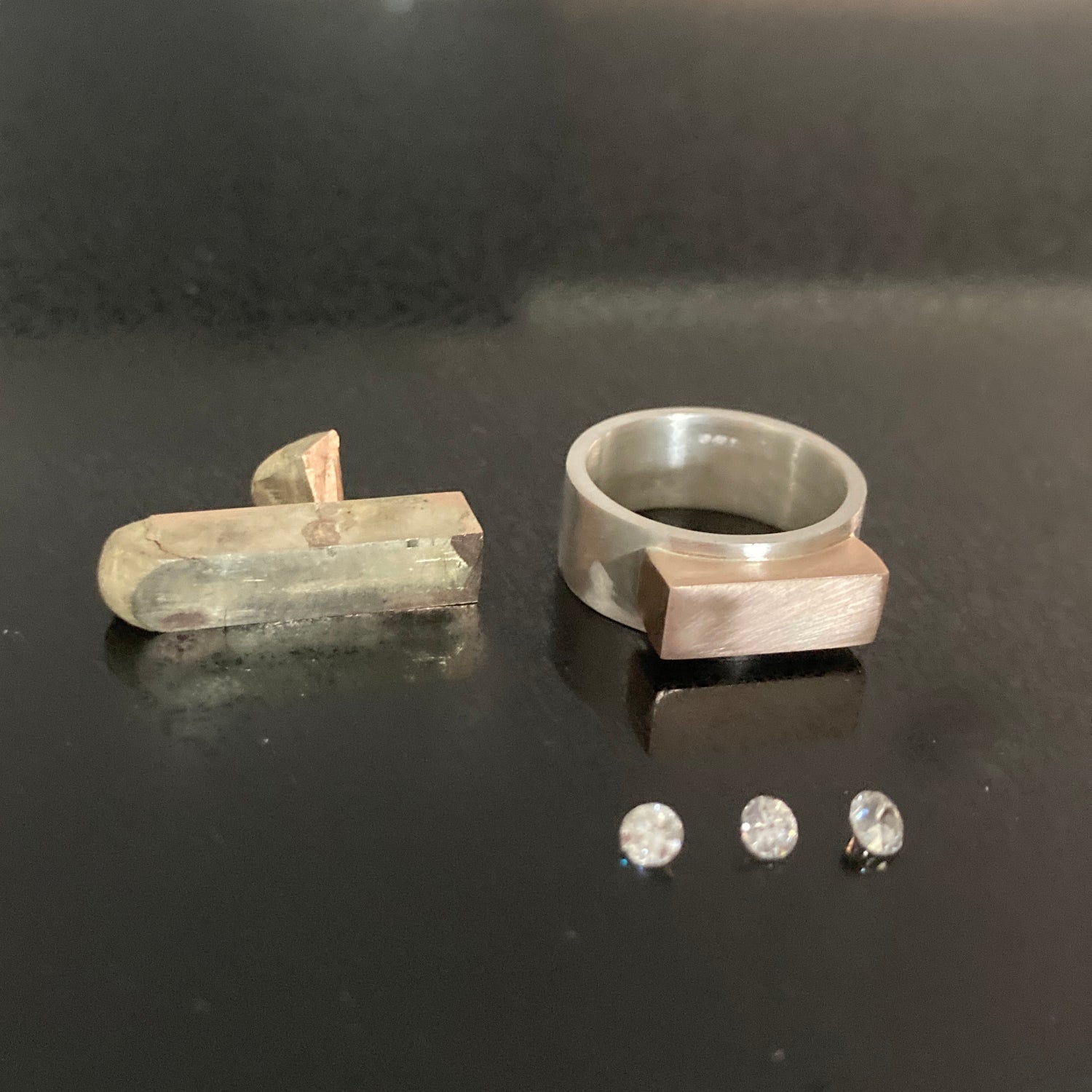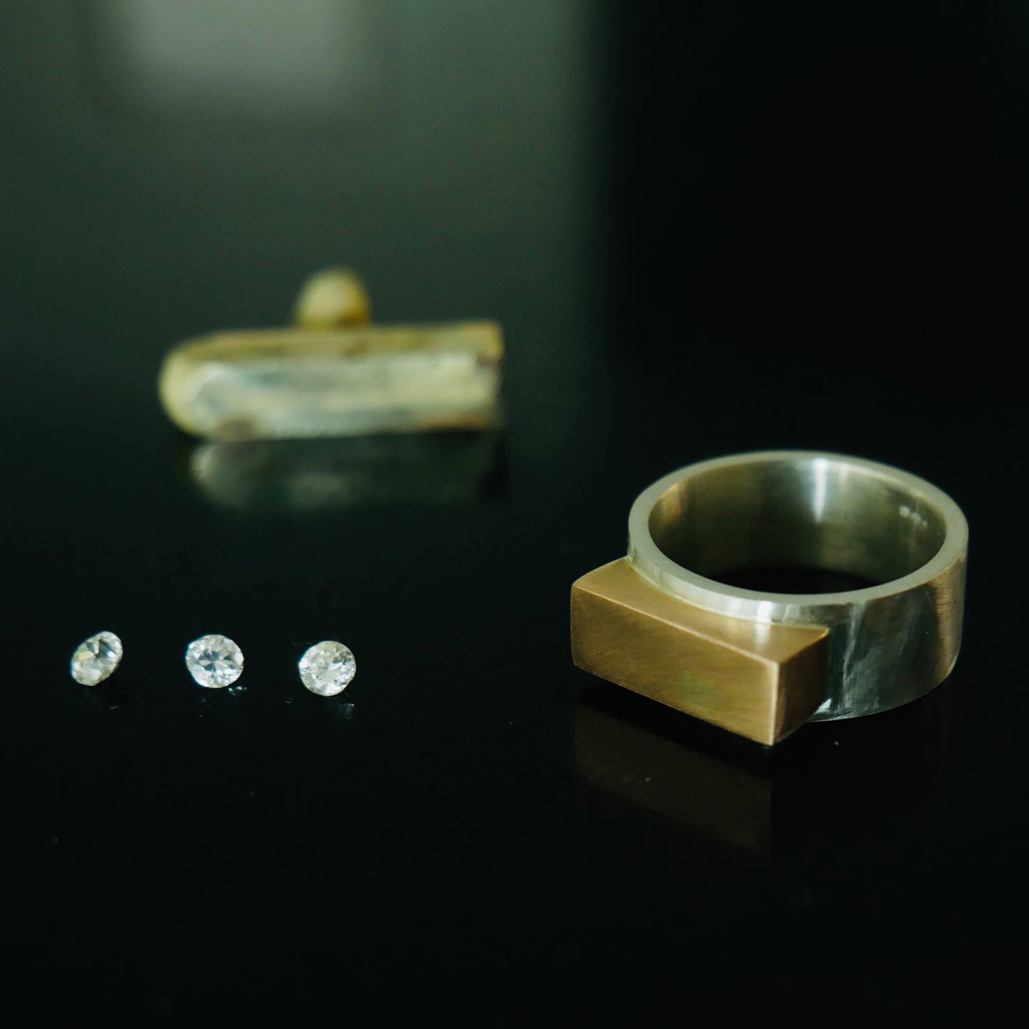 The client loved my architect ring which are normally made with square or princess-cut stones, however we came up with an option using these round diamonds that she'd been given. The gold section was made from melting down unworn gold pieces. Alice also made a simple bar necklace using the fourth diamond.