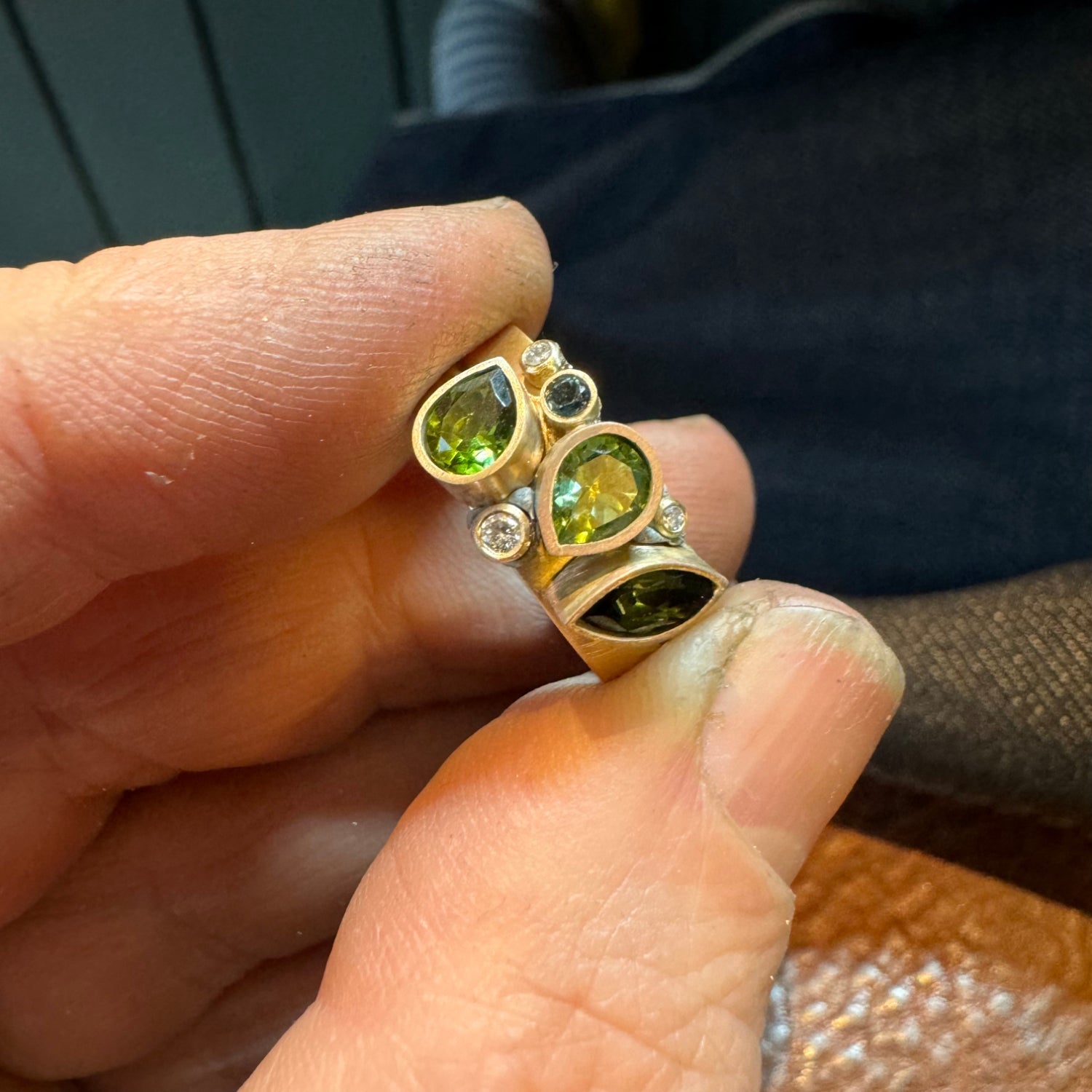 Using gold from an unworn pendant, the client wanted something similar to the diamond stacking ring available in Alice's collections. She had some tiny diamonds from a broken pair of earrings and Alice sourced some beautiful tourmalines. There was enough gold left over to make a simple gold wedding band to replace one her husband had lost.